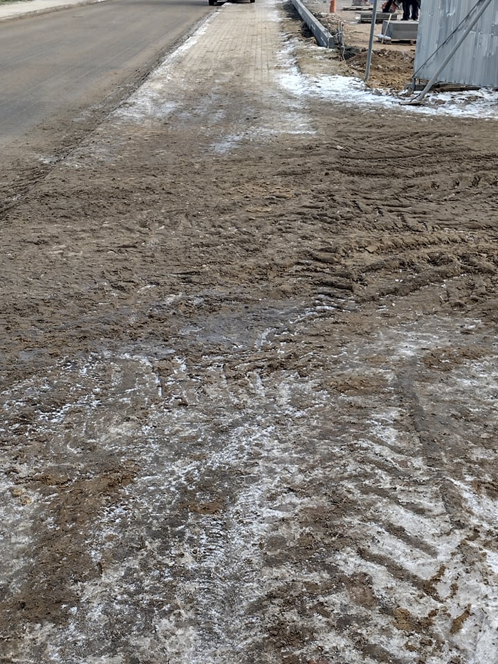 Gdy rozpoczynała się budowa zauważyłam, że wielkie samochody budowlane „wywożą” na swoich ogromnych kołach naprawdę sporo ziemi, śliskiego błota i piachu z terenu budowy. Błoto zalega na chodniku i sporym odcinku jezdni. Omijałam błotnistą breję przechodząc na drugą stronę ulicy. Co nie zawsze było proste, jezdnia też jest bardzo zabłocona.