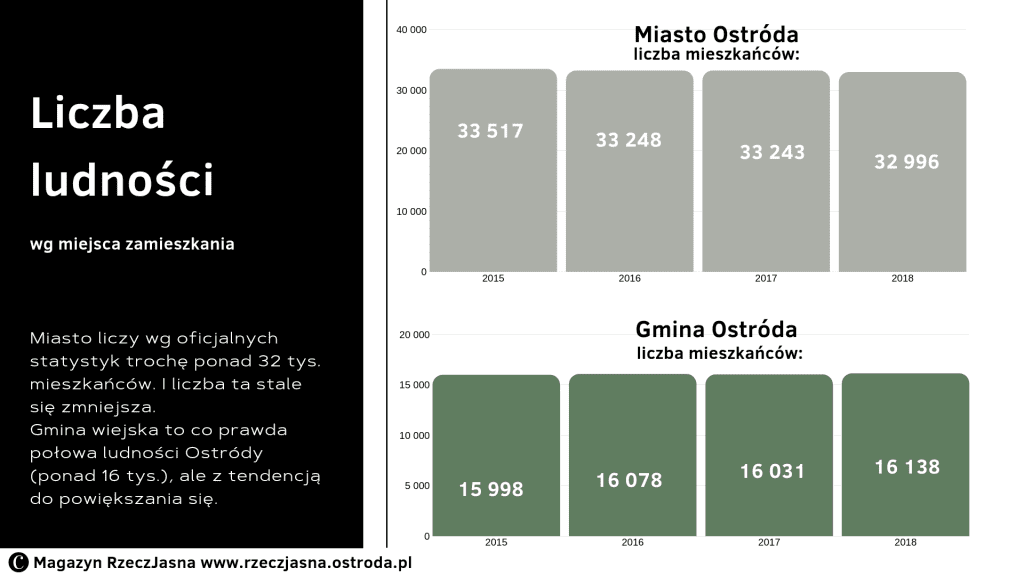 Spójrzmy jednak nie na infrastrukturę, lecz na ludzi.  Miasto liczy, wg oficjalnych statystyk, trochę ponad 32 tys. mieszkańców. I liczba ta stale się zmniejsza. Gmina wiejska to, co prawda, połowa ludności Ostródy (ponad 16 tys.), ale z tendencją do powiększania się.