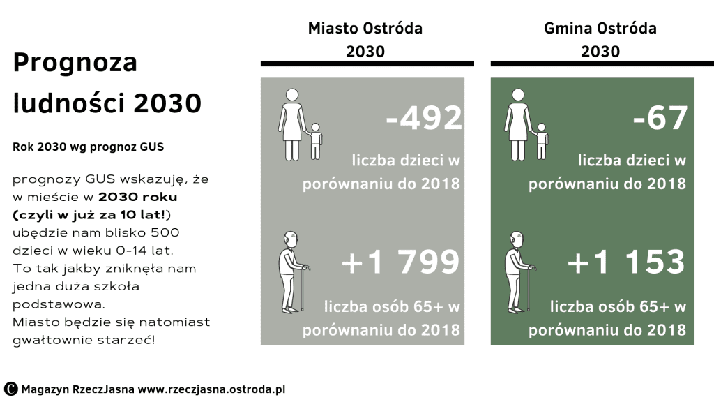 Potwierdzają tę tendencję prognozy ludności przygotowywane przez Główny Urząd Statystyczny. Do 2030 roku Ostródzie ubędzie ponad 2 000 mieszkańców. W tym czasie gmina wiejska Ostróda nieznacznie się powiększy!