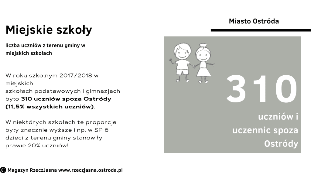Jak pokazuje „Sprawozdanie z realizacji polityki oświatowej prowadzonej przez Gminę Miejską Ostróda w latach 2012-2018”, liczba uczniów z terenu Gminy Ostróda (i innych miejscowości) uczęszczających do szkół miejskich w roku szkolnym 2017/2018 wyniosła w miejskich szkołach podstawowych i gimnazjach 310 osób (11,5% wszystkich uczniów).