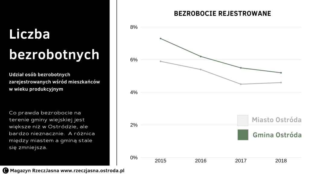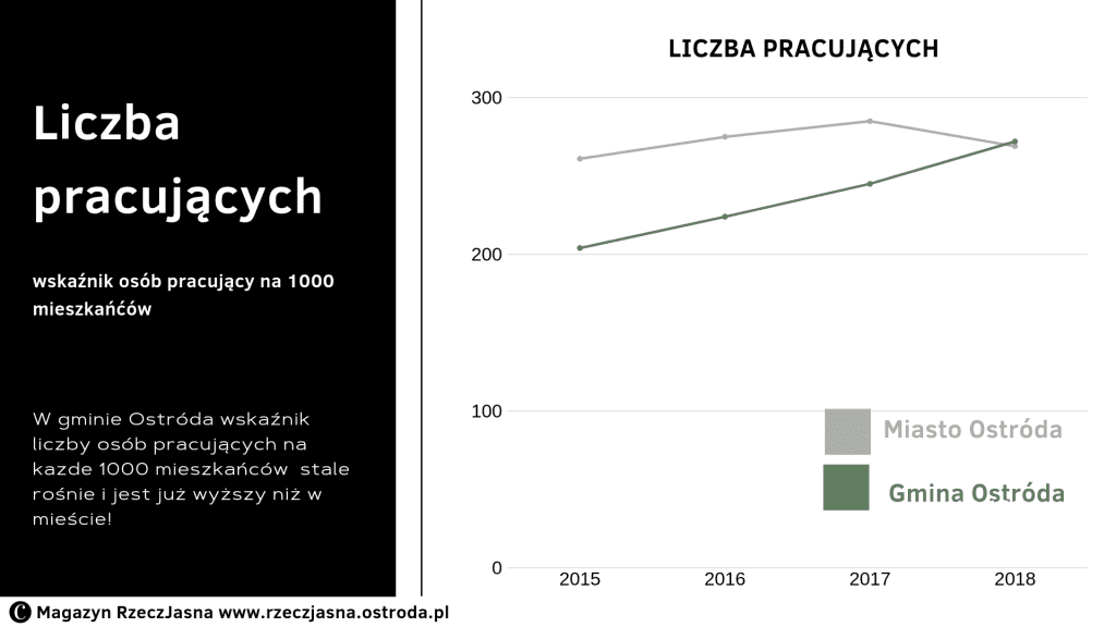 Być może stereotypowo zakładacie Państwo, że gmina wiejska jest biednym obszarem o wysokim bezrobociu. Nic bardziej mylnego! Co prawda bezrobocie na terenie gminy wiejskiej jest większe niż w Ostródzie, ale bardzo nieznacznie. A wskaźnik liczby osób pracujących na 1000 mieszkańców w przeciwieństwie do miasta stale rośnie i jest już wyższy niż w Ostródzie.
