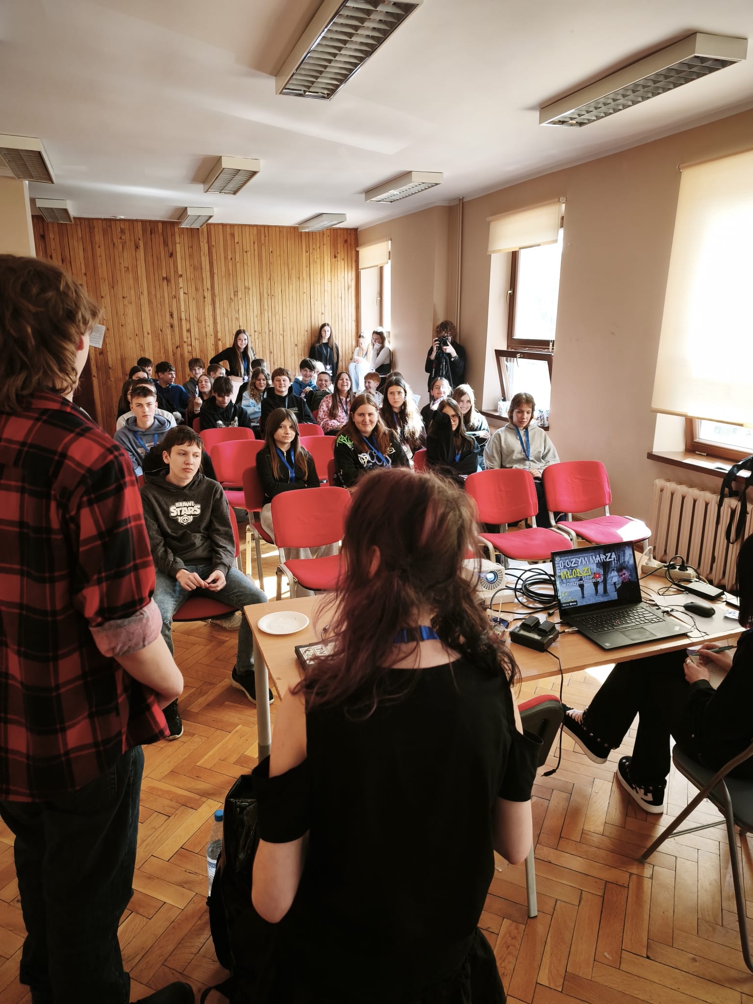 Było kilka momentów, które zapadły mi w pamięć, a w szczególności były to pytania jednego z uczniów klasy, z którą realizowaliśmy nasze pierwsze warsztaty. Od samego początku chłopak o którym mówię (i jeżeli to czyta, z całego serca pozdrawiam), zadawał nam różne pytania, na które odpowiedź, jak mi się zdaje, naprawdę go ciekawiła. Miałem wrażenie, że ma w sobie właśnie tę podstawę, potrzebną, żeby stworzyć dobry temat, czyli ciekawość.