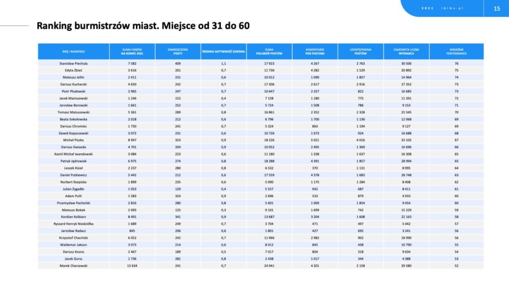 W całym Rankingu wśród najbardziej wpływowych profili znajdują się kanały włodarzy zarówno małych miasteczek, jak i prężnie działających miast powiatowych. Jak zauważają autorzy Raportu Burmistrzowie potrafią generować wyniki nie gorsze od prezydentów miast wojewódzkich czy marszałków! Najwyraźniej wielkość miasta dla budowania skutecznego kontaktu z mieszkańcami nie jest aż taka istotna.