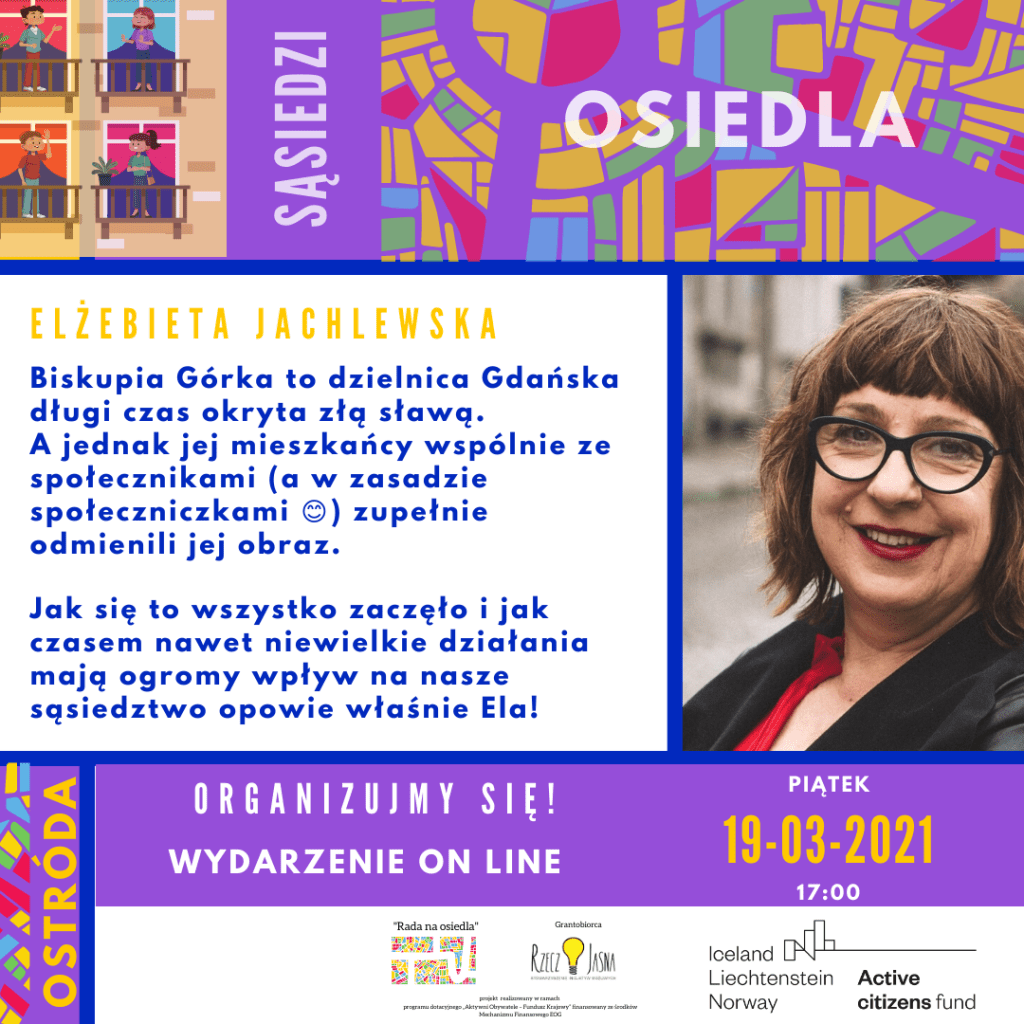 Biskupia Górka to dzielnica Gdańska długi czas okryta złą sławą. A jednak jej mieszkańcy wspólnie ze społecznikami (a w zasadzie społeczniczkami 😊) zupełnie odmienili jej obraz.  Jak się to wszystko zaczęło i jak czasem nawet niewielkie działania mają ogromy wpływ na nasze sąsiedztwo opowie właśnie Ela.