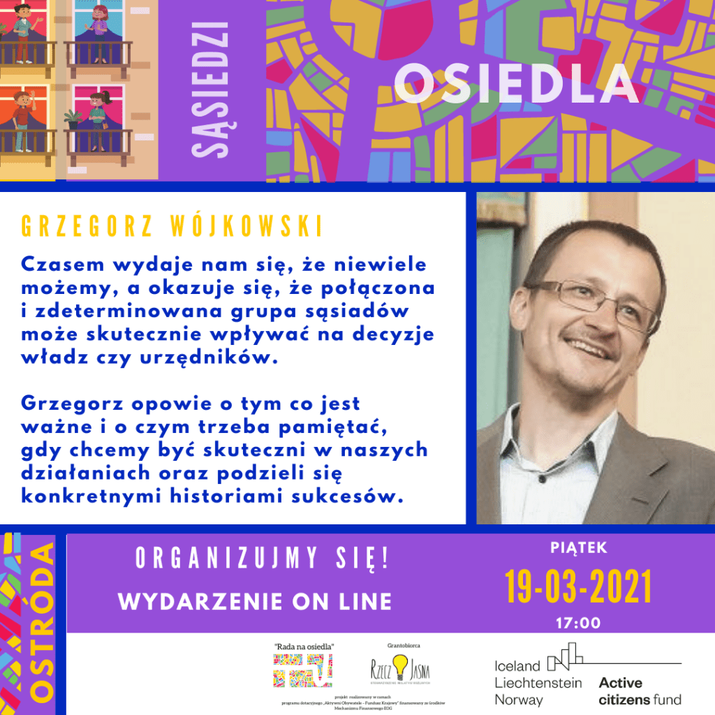 Czasem wydaje nam się, że niewiele możemy, a okazuje się, że połączona i zdeterminowana grupa sąsiadów może skutecznie wpływać na decyzje władz czy urzędników. Grzegorz opowie o tym co jest ważne i o czym trzeba pamiętać, gdy chcemy być skuteczni w naszych działaniach oraz podzieli się konkretnymi historiami sukcesów.